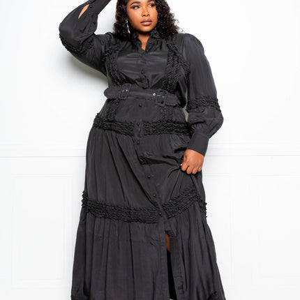 Elevate your wardrobe with our Belted Shirt Dress with Ruffle Detail, a sophisticated and chic piece designed to enhance your...