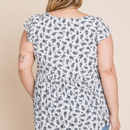 Experience the charm of bohemian style with our Plus Size Paisley Flutter Sleeves Top. This printed babydoll top is...