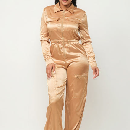 Enhance your wardrobe with our Satin Solid Zipper Detail Jumpsuit, available in 3 colors and sizes S, M, and L....