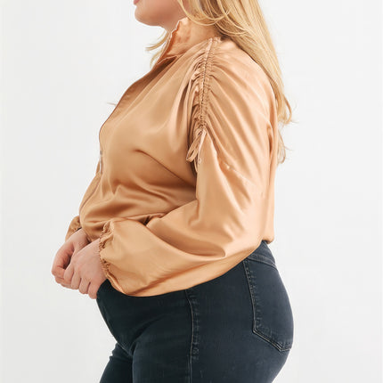 Introducing the Plus Satin Zip-up Ruched Long Sleeve Cropped Bomber Jacket, a fashionable and comfortable addition to elevate your wardrobe....