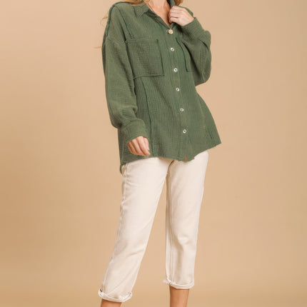Elevate your wardrobe with our Mineral Wash Button Down Top with High Low Hem, a chic and versatile piece that...