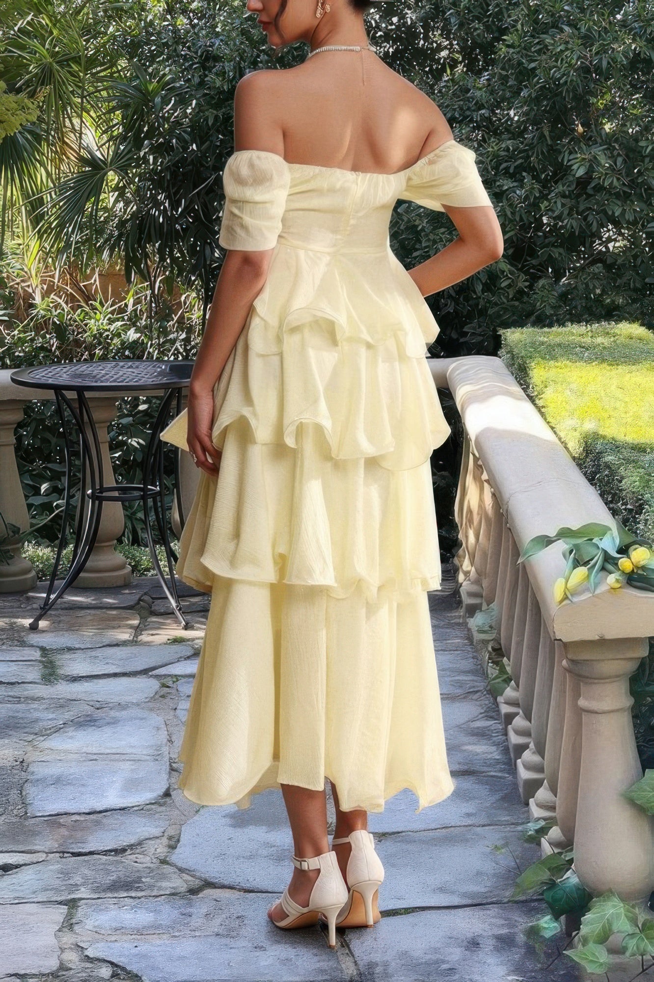 Off Shoulder Puff Short Sleeves Tiered Dress