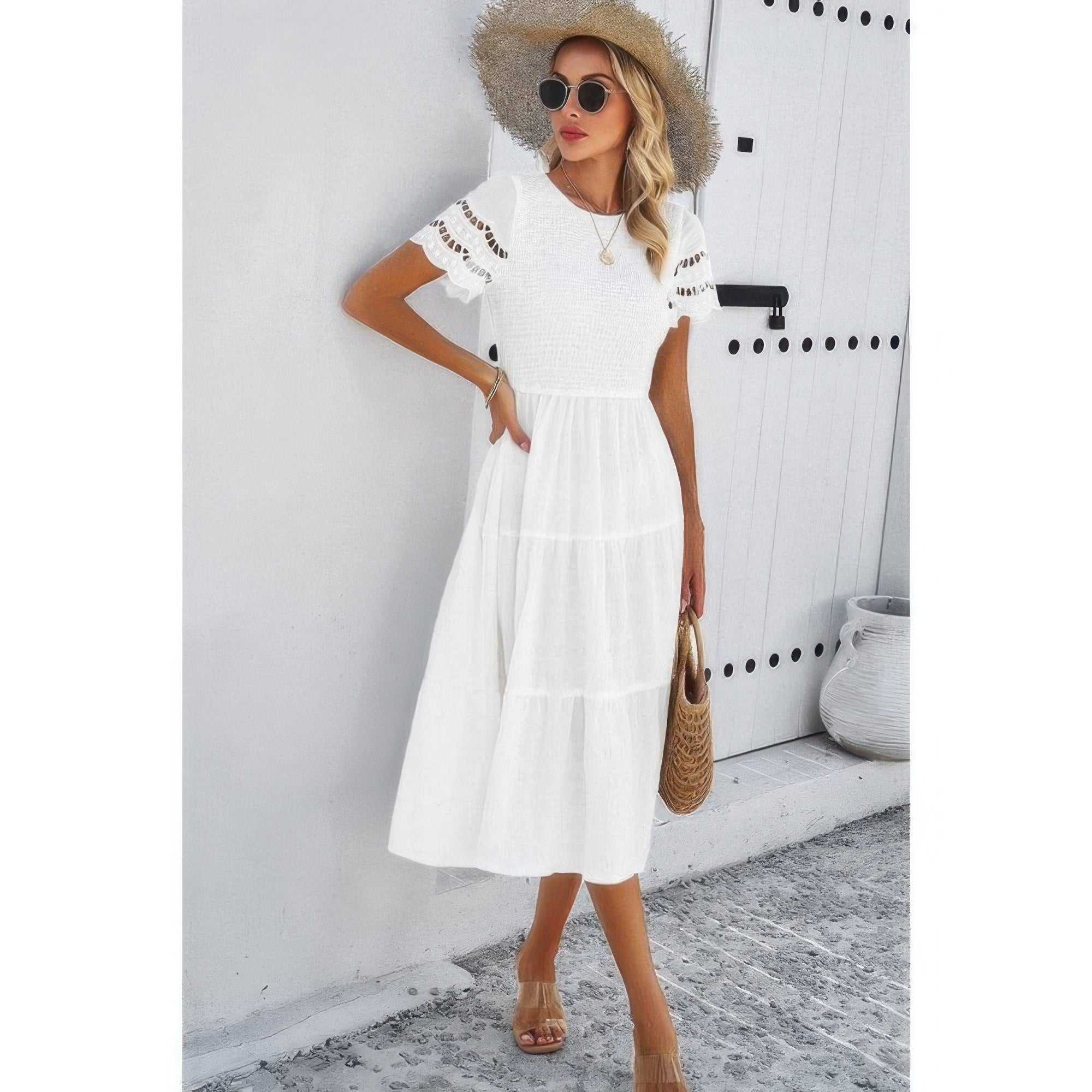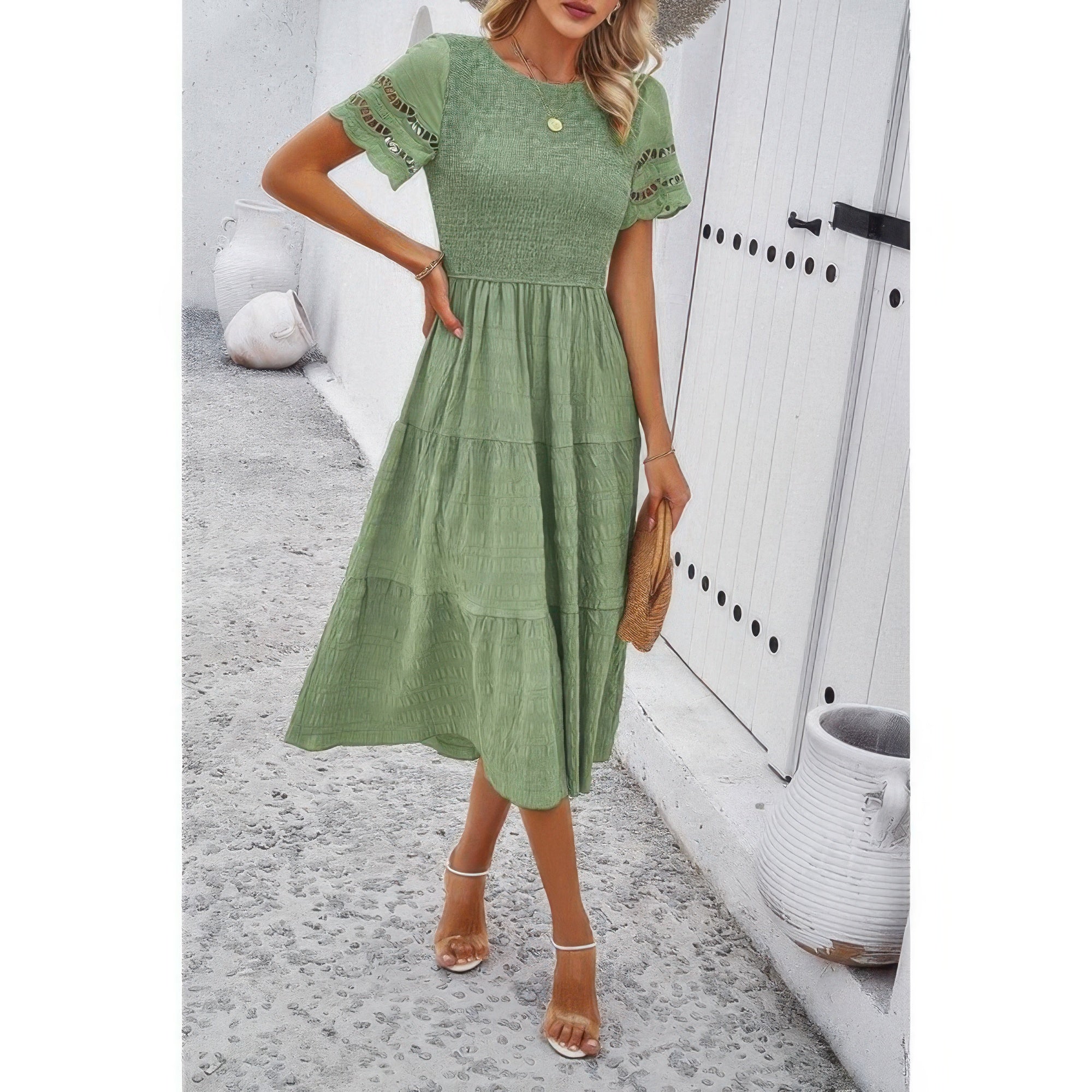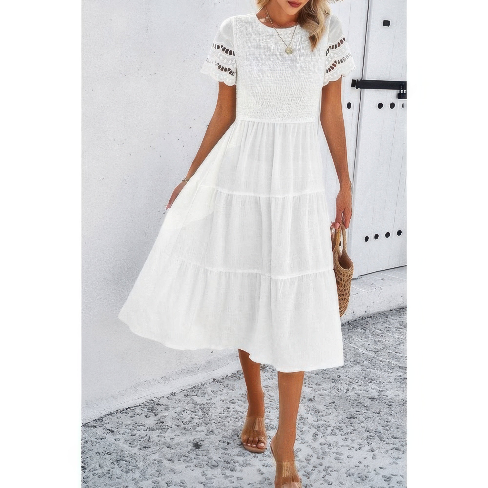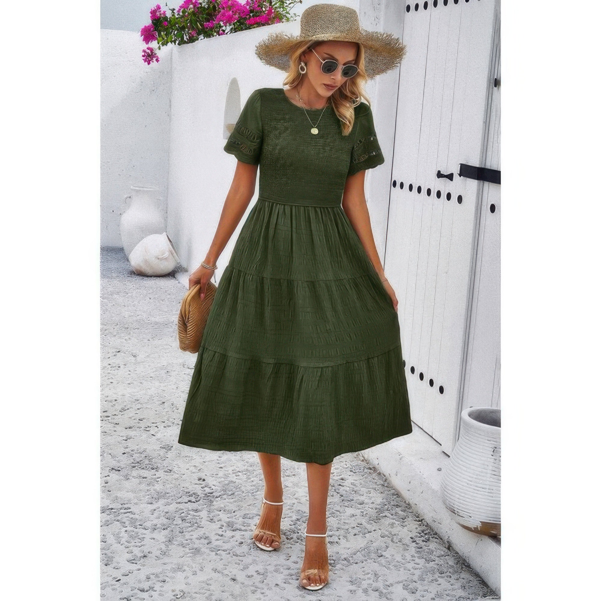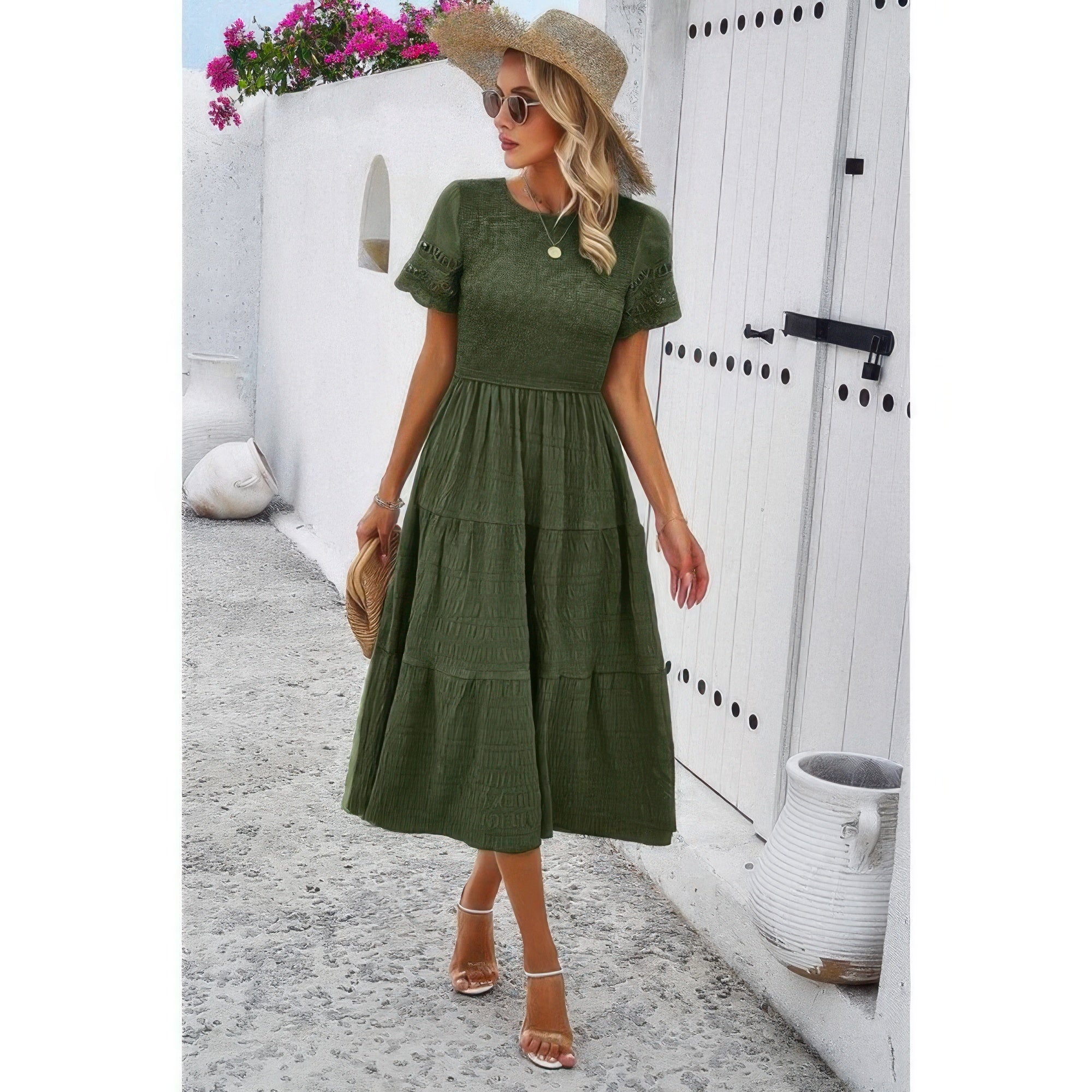 Lace Round Neck Ruched Fit Ruffle Solid Dress