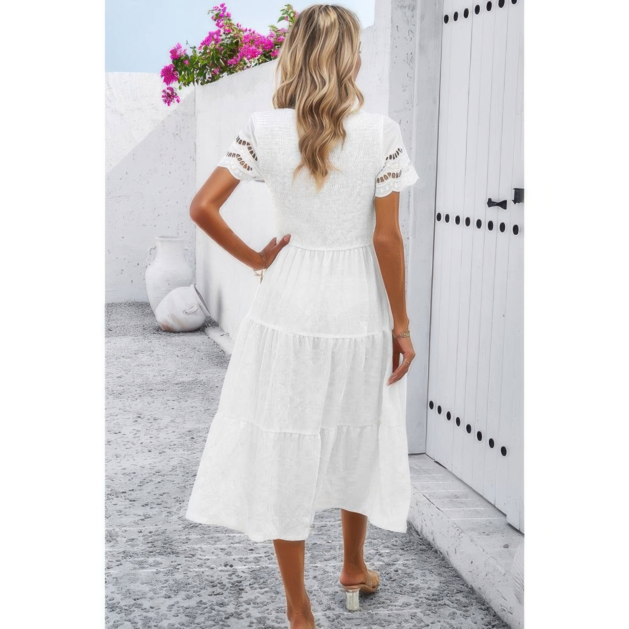 Product Description:Feminine and flattering, this Lace Round Neck Ruched Fit Ruffle Solid Dress is designed to elevate your everyday style...